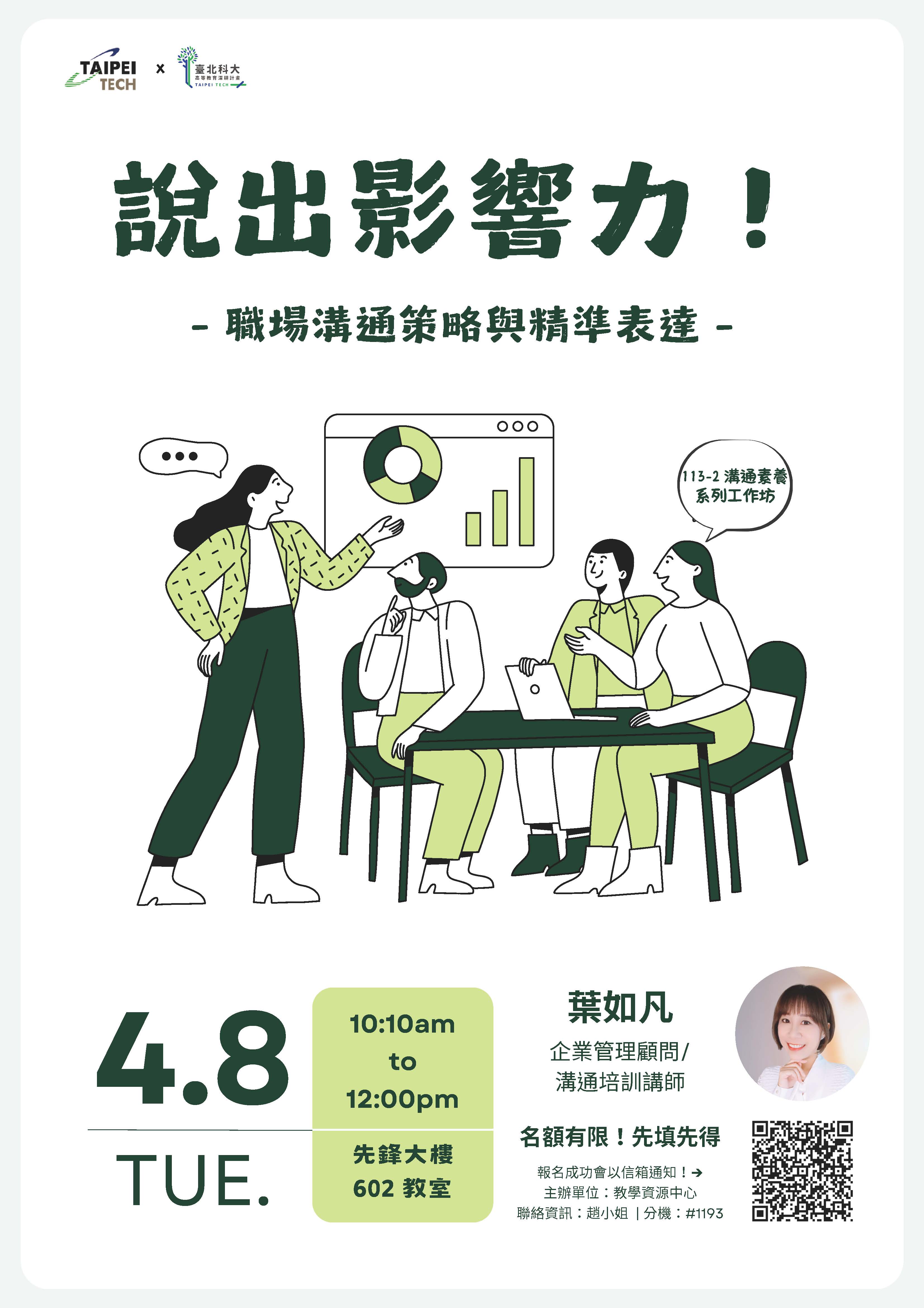【講座】04/08(二)10:10-12:00 主題:【說出影響力!職場溝通策略與精準表達】