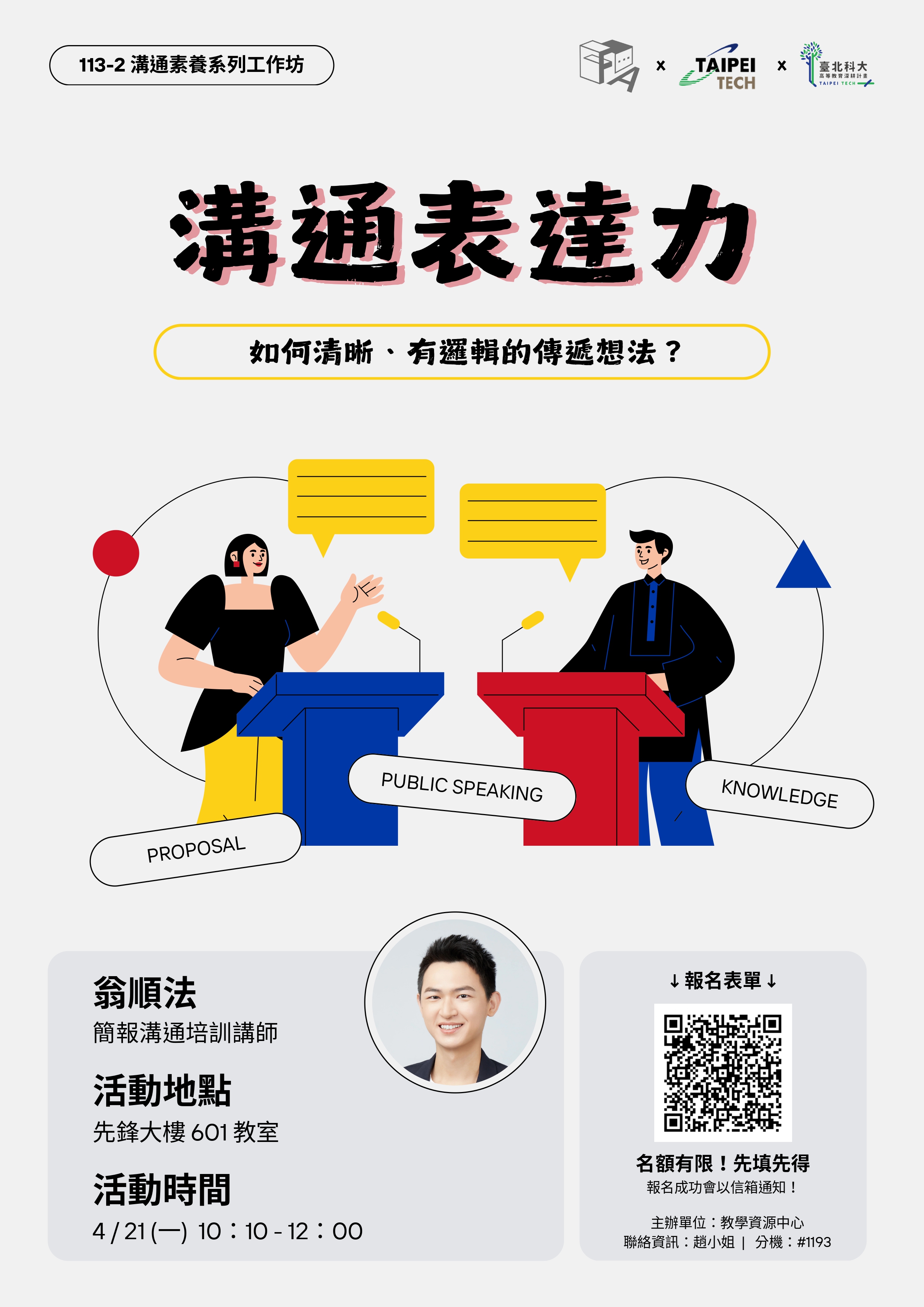【講座】04/21(一)10:10-12:00 主題:【溝通表達力-如何清晰、 有邏輯的傳遞想法】