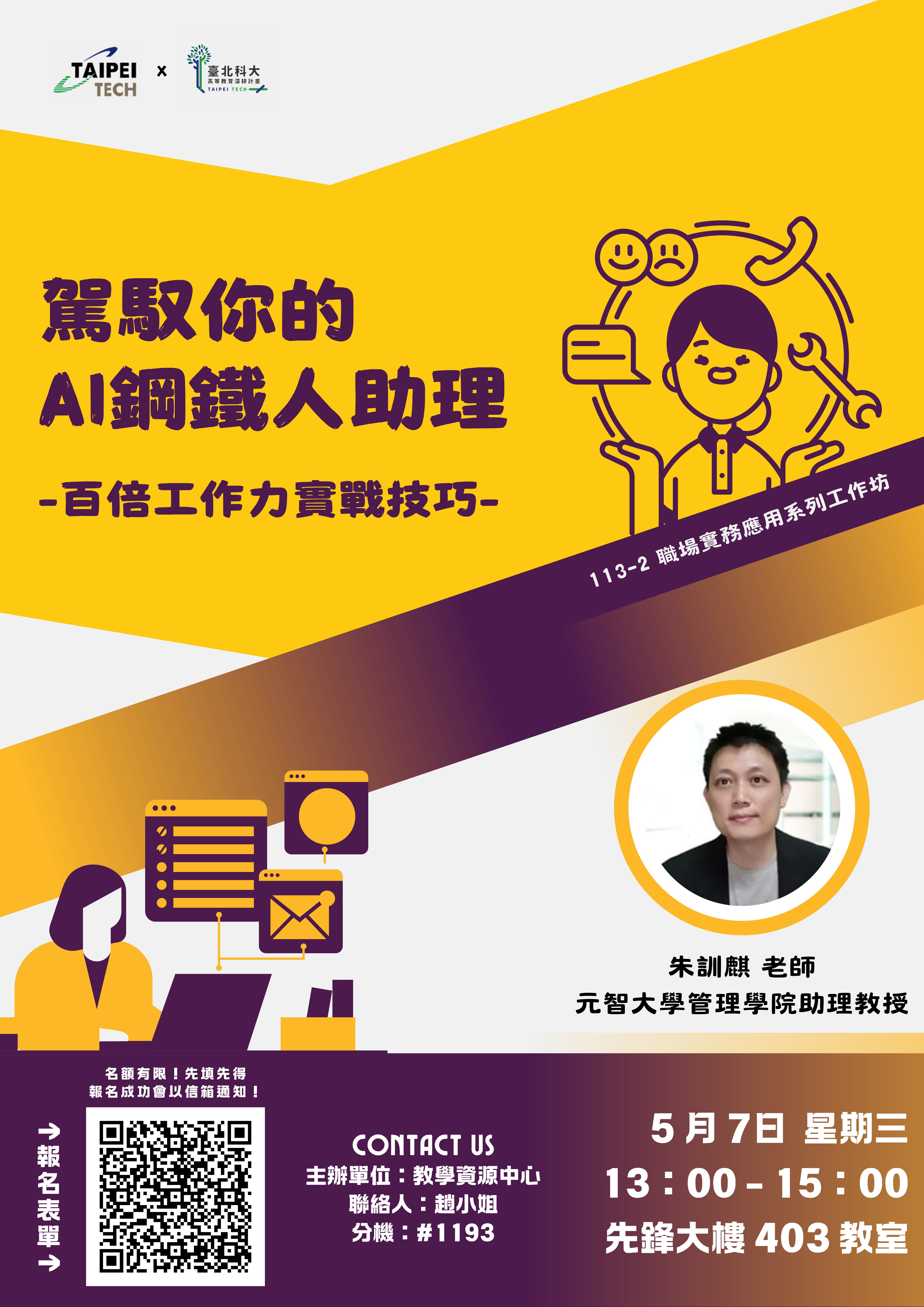 【講座】5/7(三)13:00-15:00 主題:【駕馭你的AI鋼鐵人助理- 百倍工作力實戰技巧】